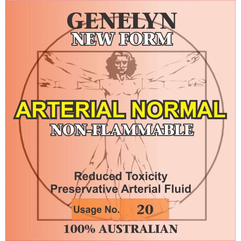 Genelyn Arterials can be safely used for waterless embalming. Recommended usage is one third Pre/Co Injection fluid, one third Chelator and one third Genelyn Arterial Fluid.